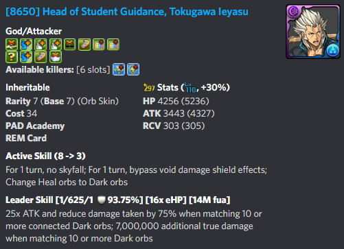 Between the two of them they cover both Blind and Jammer, and have perfect leader synergy. Tokugawa brings the large (seven million) Auto Follow-up leader skill, and Ina brings the plus combo (two) leader skill. Both require ten or more dark orbs to be matched for activation, but that isn’t really an issue assuming you lead with baran for the 7×6 board. Ina unlocks your board and then after floor 4 makes you dark orbs, Tokugawa voids VDP and once again makes dark orbs. This means you have both 3 floors until floor 4, and then a 1 turn break in between both actives to find dark orbs. Fortunately basically every dark card these days seems to generate dark orbs on a tiny cooldown, so really just take your pick of which you like most for that dungeon.