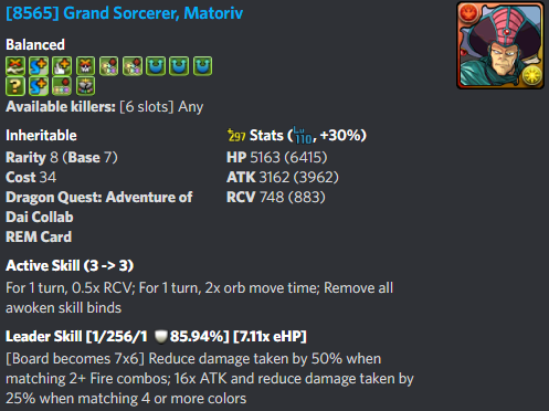This card is nothing new, or that we haven’t seen before. It does what so many other rainbow leads do, granted only requiring 3 colors not the full 5 to activate. That doesn’t make it any more exciting though. This active skill seems almost fully tailored to clear MD2. A three turn cooldown that clears unmatchable, in a dungeon that spams you with unmatchable status, is what we all want.