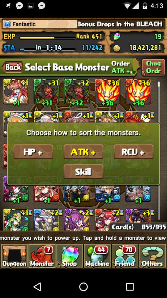 Firstly, you need to organize your plus eggs and thankfully, GungHo has implemented a means to sort your pluses by HP, ATK, and RCV. You have to go into Chng Ordr-> Special -> choose: