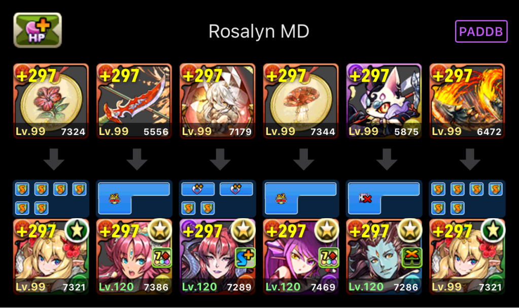 Rosalyn is a combo-based leader relying on a flood of red orbs from her fire skyfall buff. Her team should stack red combo enhance (tako) awakenings to scale her active skill and improve her damage output. Common team templates damage-cap Rosalyn with just 3 red combos, so players should practice conserving excess red orbs. Most team templates cannot afford a heart generator so players should also learn what hit combinations they can survive through and conserve heart orbs as needed. Players will be challenged to survive the 10 turns in between the first transform and second transform.