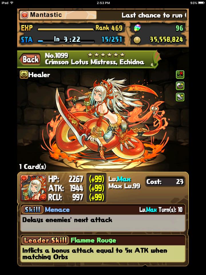 Also known as Crimson, Lotus Mistress, Echidna, she is one of the first valuable farmable monsters a new account can acquire and was actually my third hyper maxed monster. I have had great success using her on my Kirin (Sakuya) team for nearly two years. Her lower stat weight along with poor awakenings paired with new descends being anti-delayed have pushed her more out of the top meta teams, but her delay is still invaluable. Her lower exp curve combined with very accessible evolution materials and exceptionally high recovery makes her a boon to a newer account.